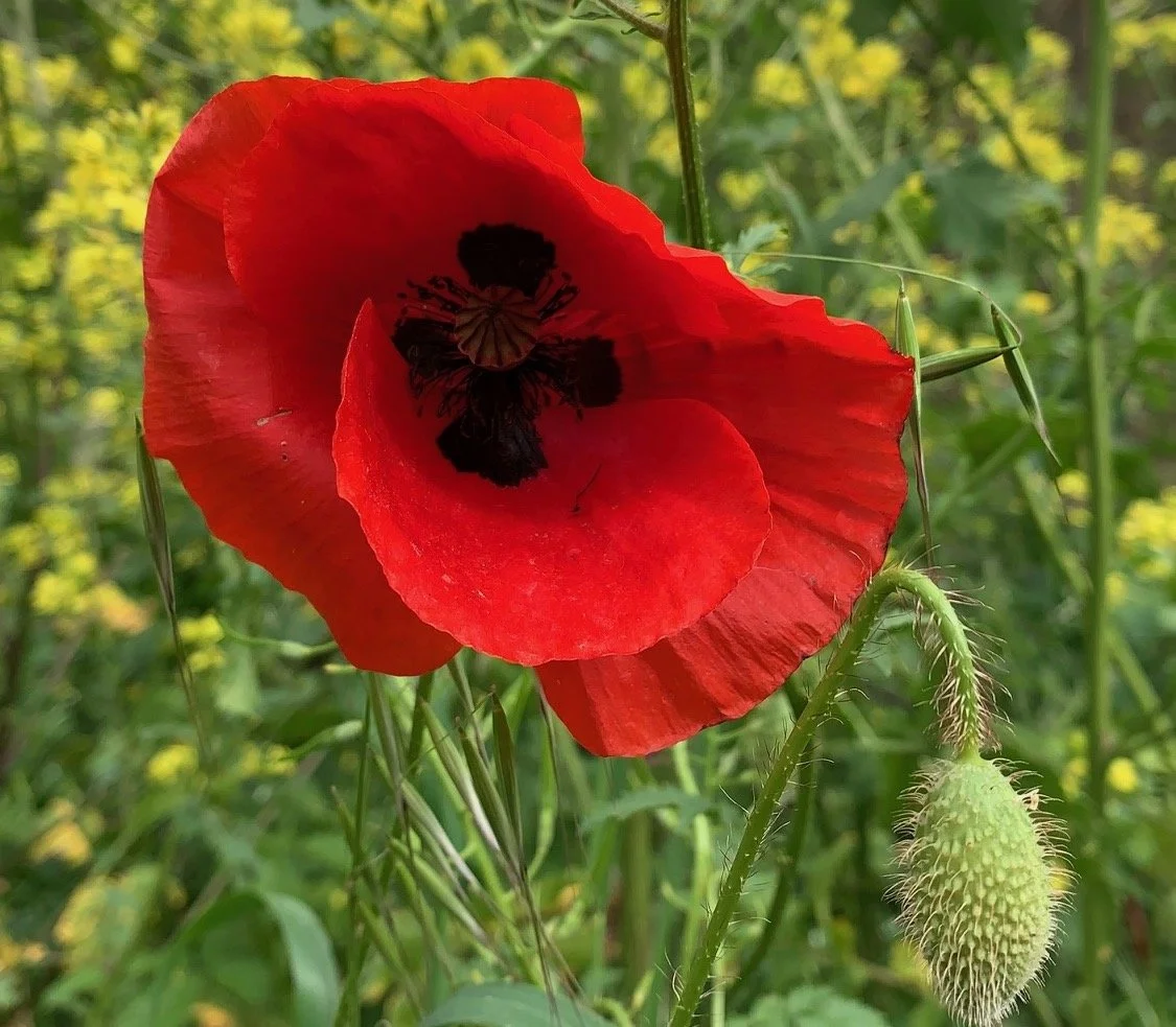 The poppies are out everywhere. The beautiful Flanders poppy. Coming up in fields and ploughed spaces. Sharp red alongside yellow Mustard flowers and purple Wood Violet all blooming together. So beautiful among the grass road edges and fields.