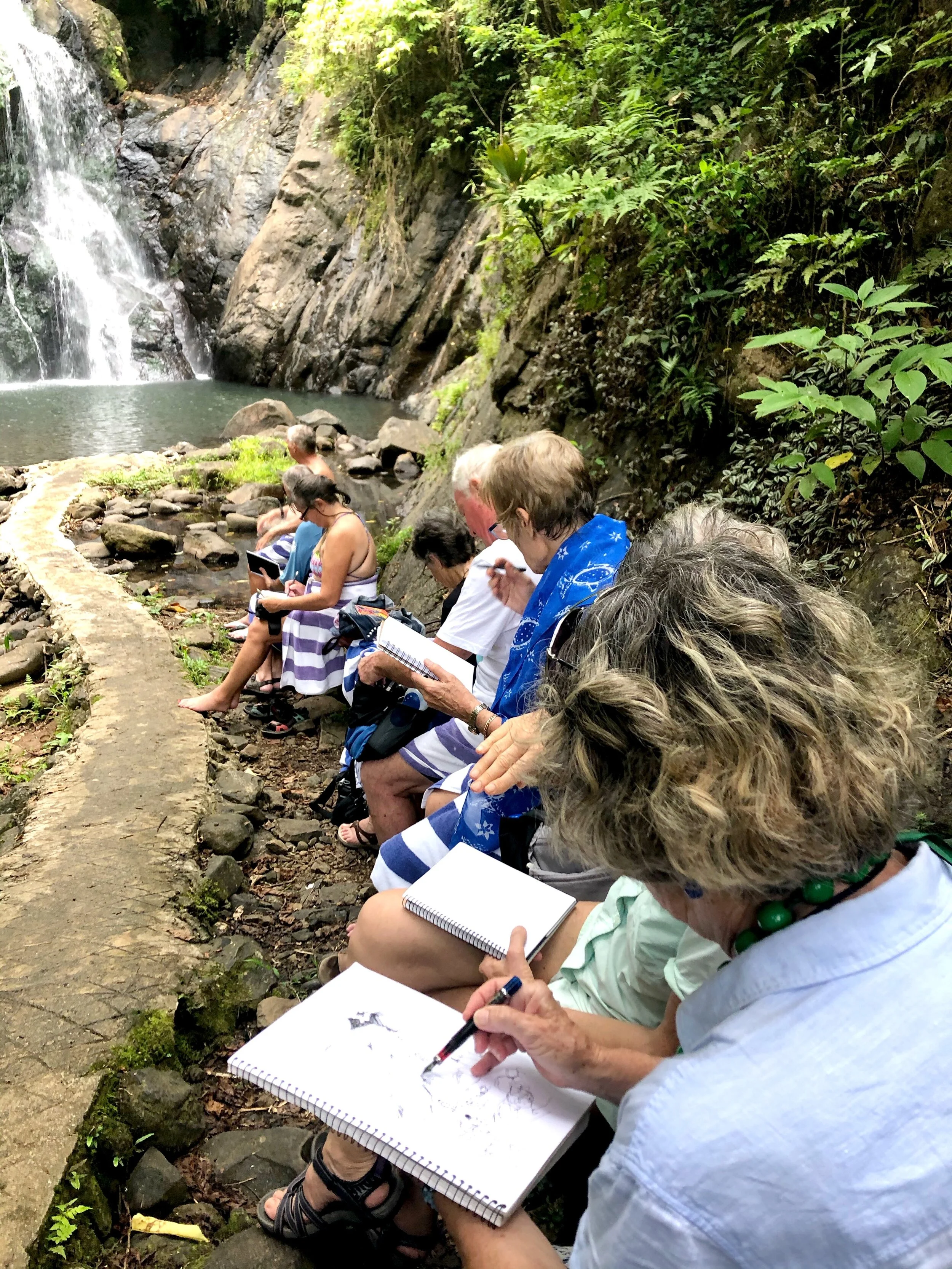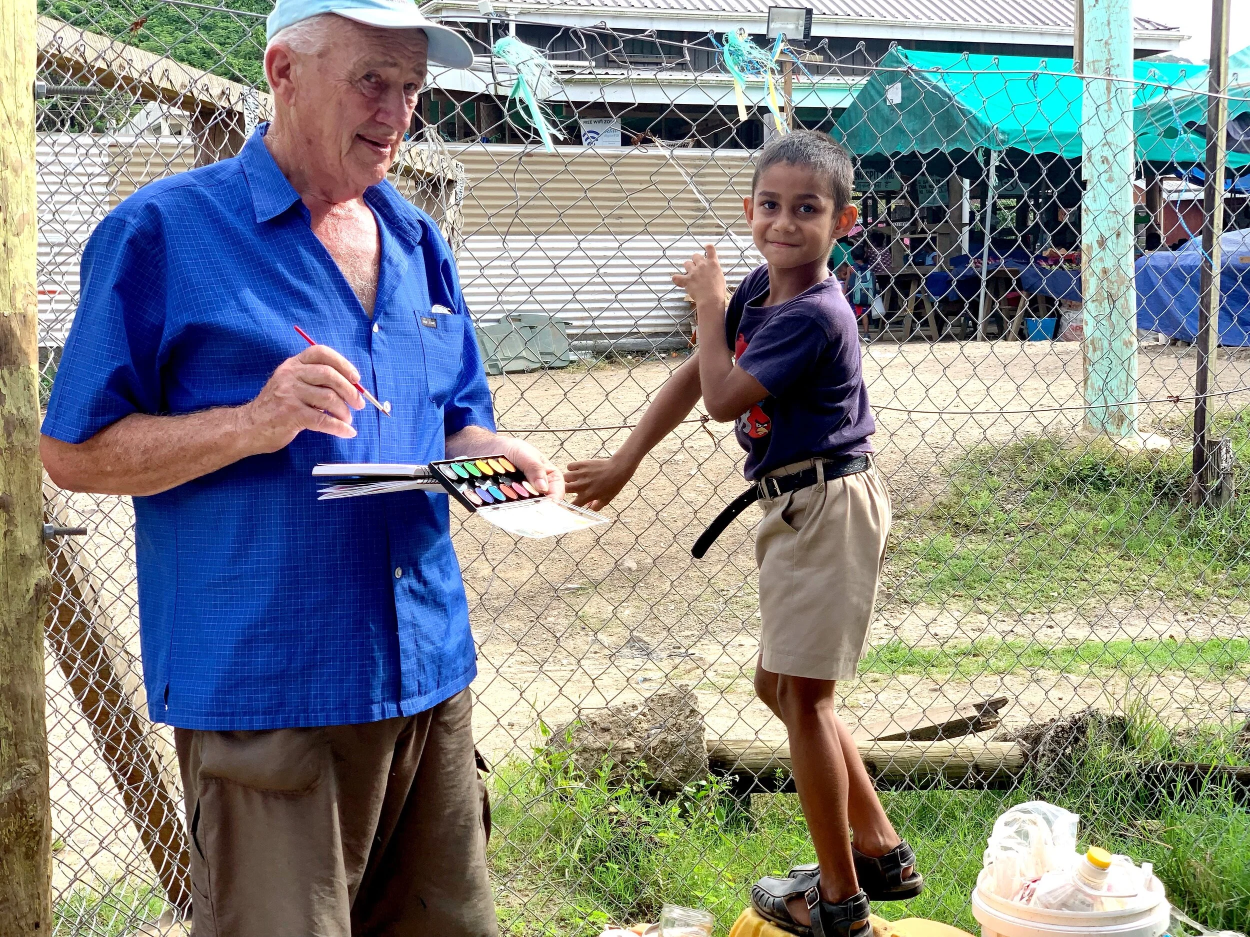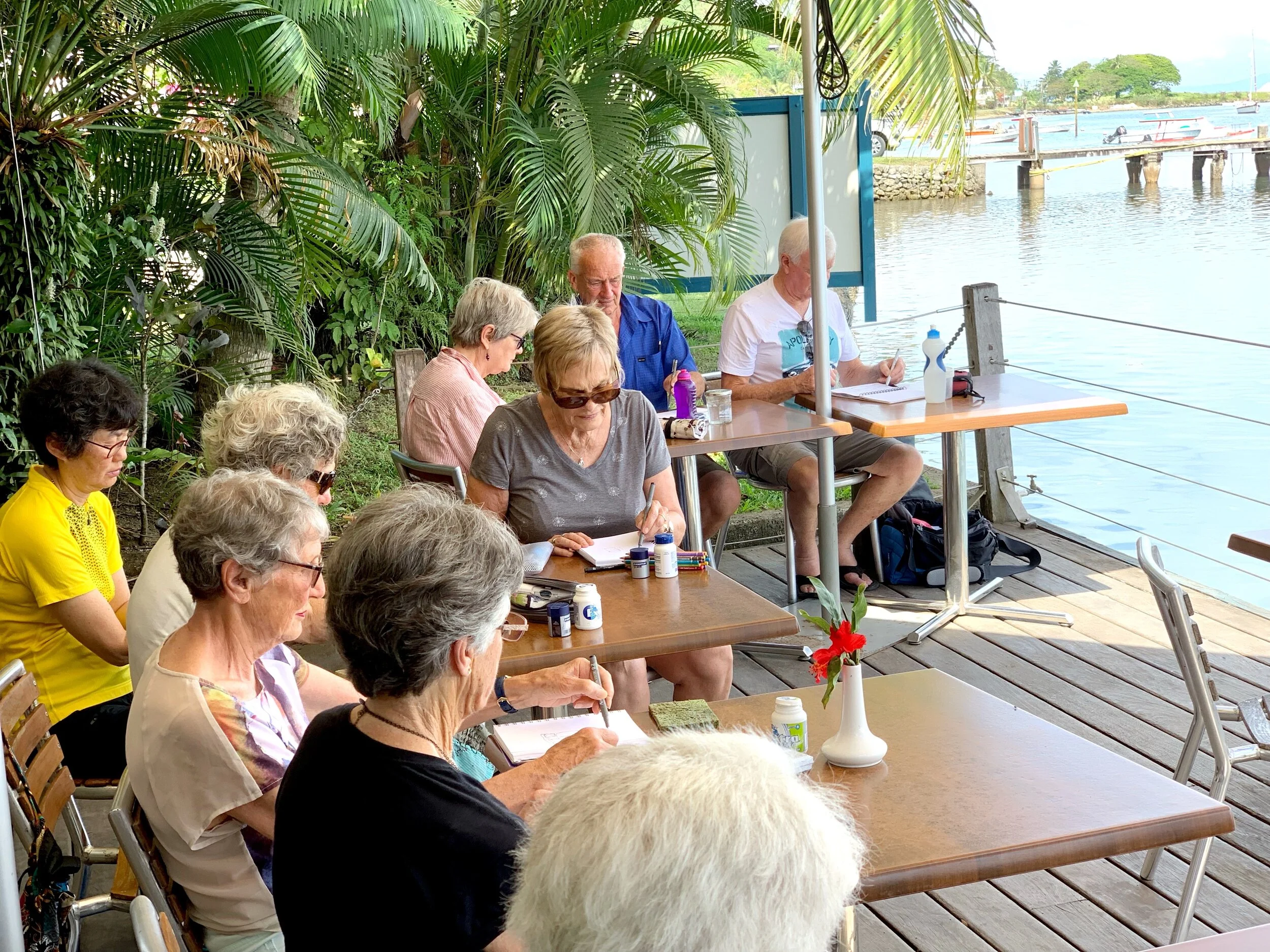 Copra Shed Cafe for boats and reflections. ‘Other hand’ sketching. Visiting a local village and the Vuadomo Waterfall.