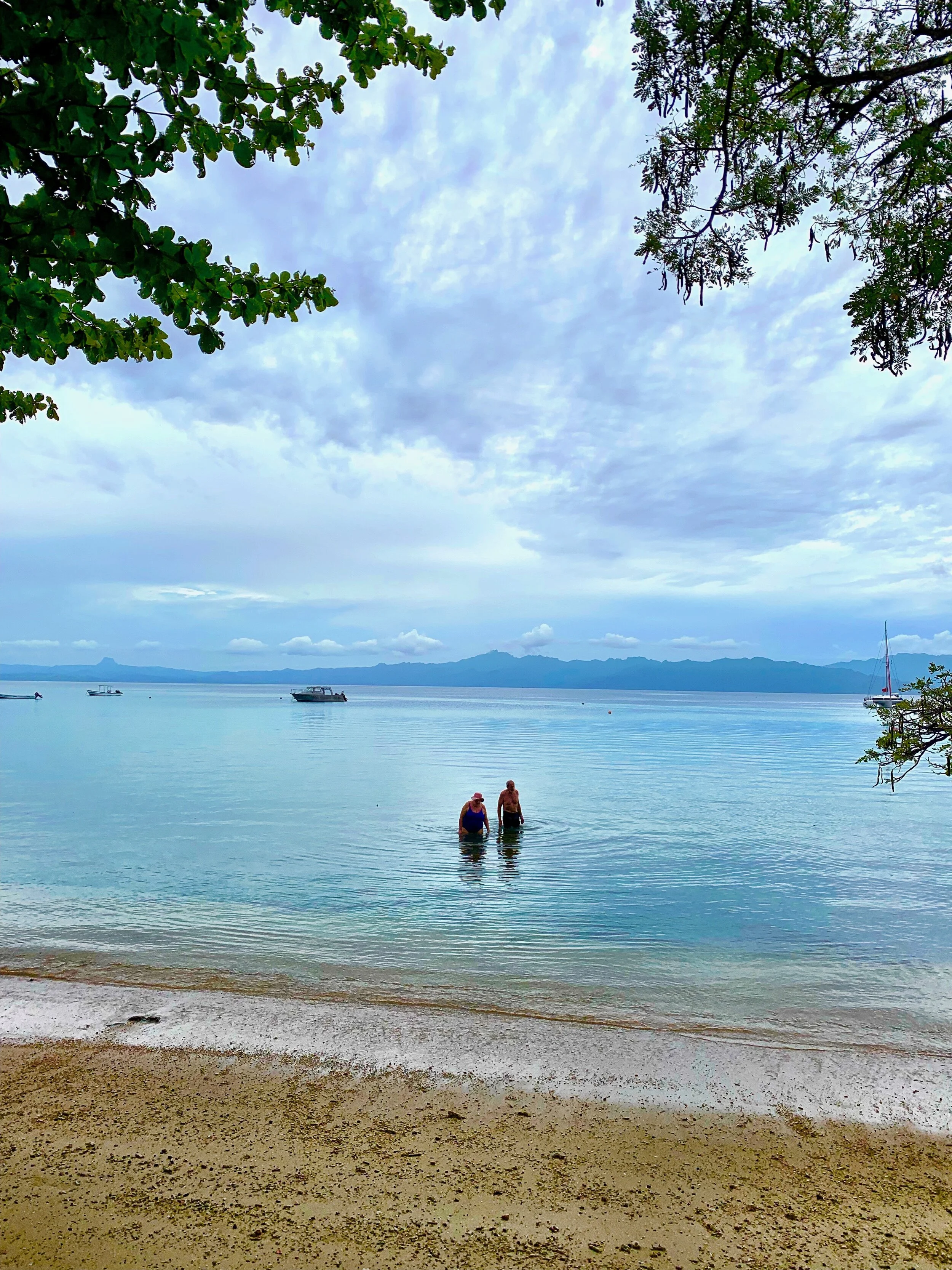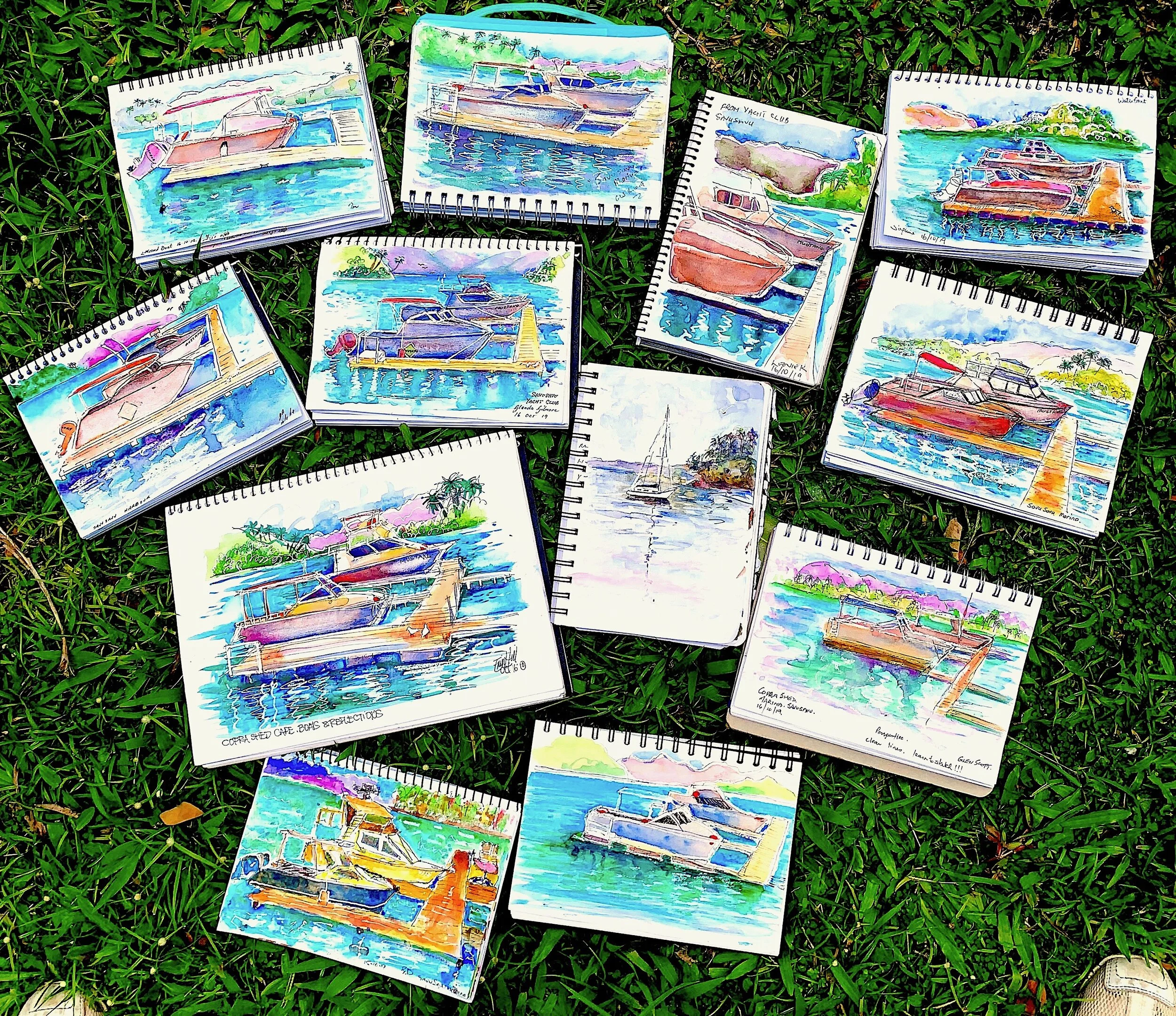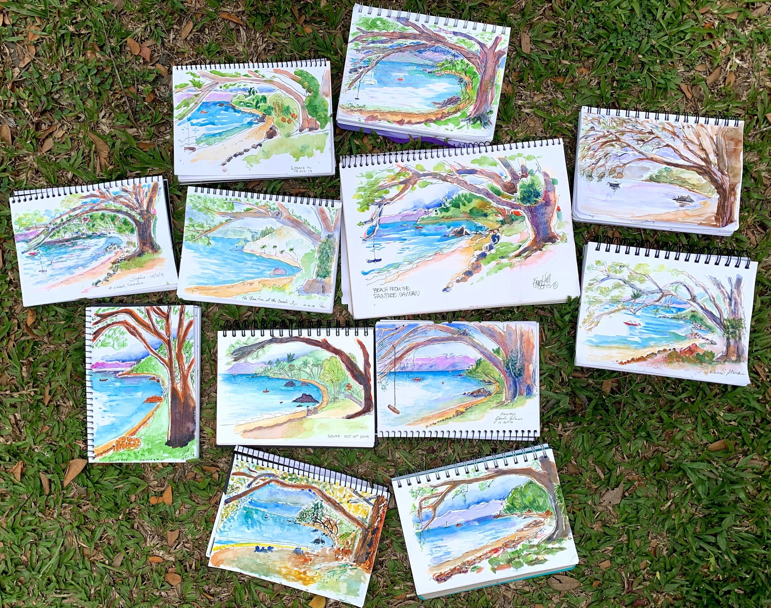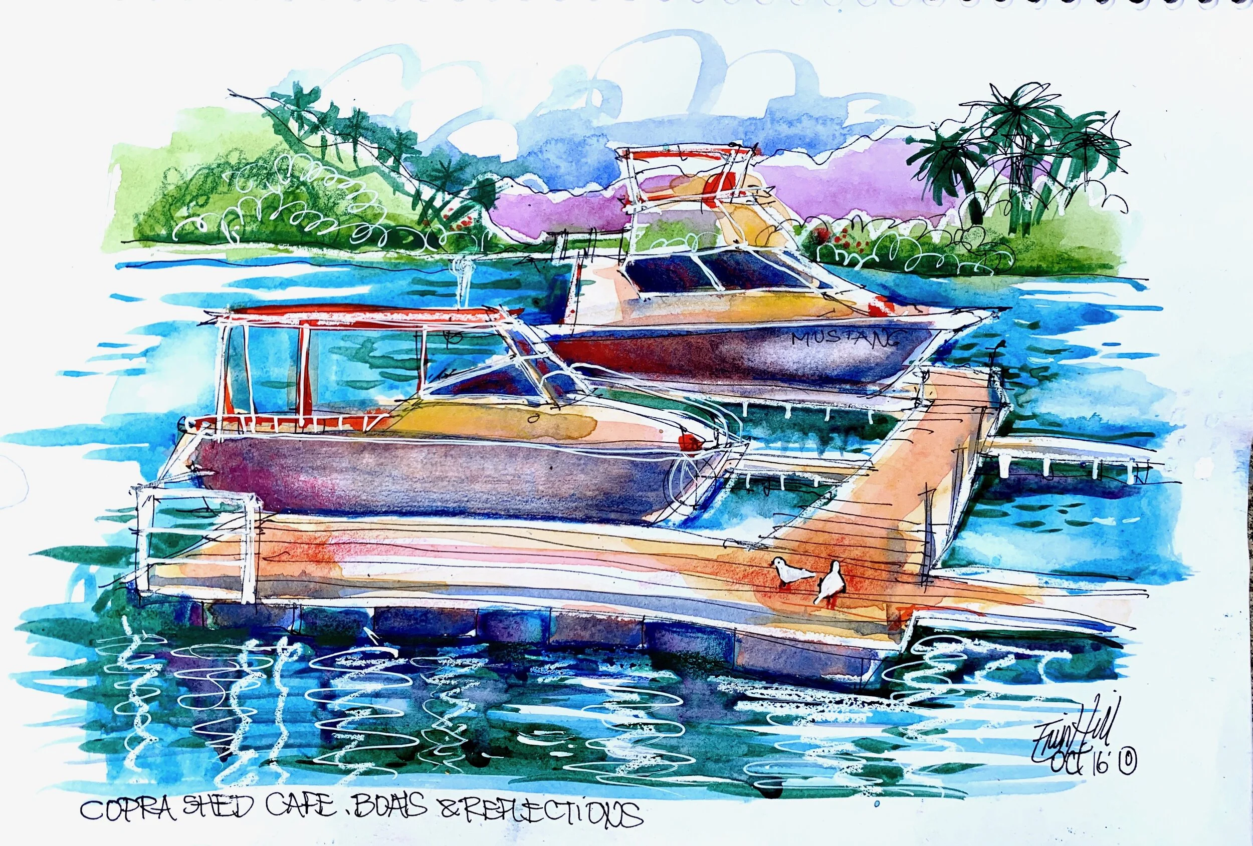 Copra Shed Cafe for boats and reflections. ‘Other hand’ sketching. Visiting a local village and the Vuadomo Waterfall.