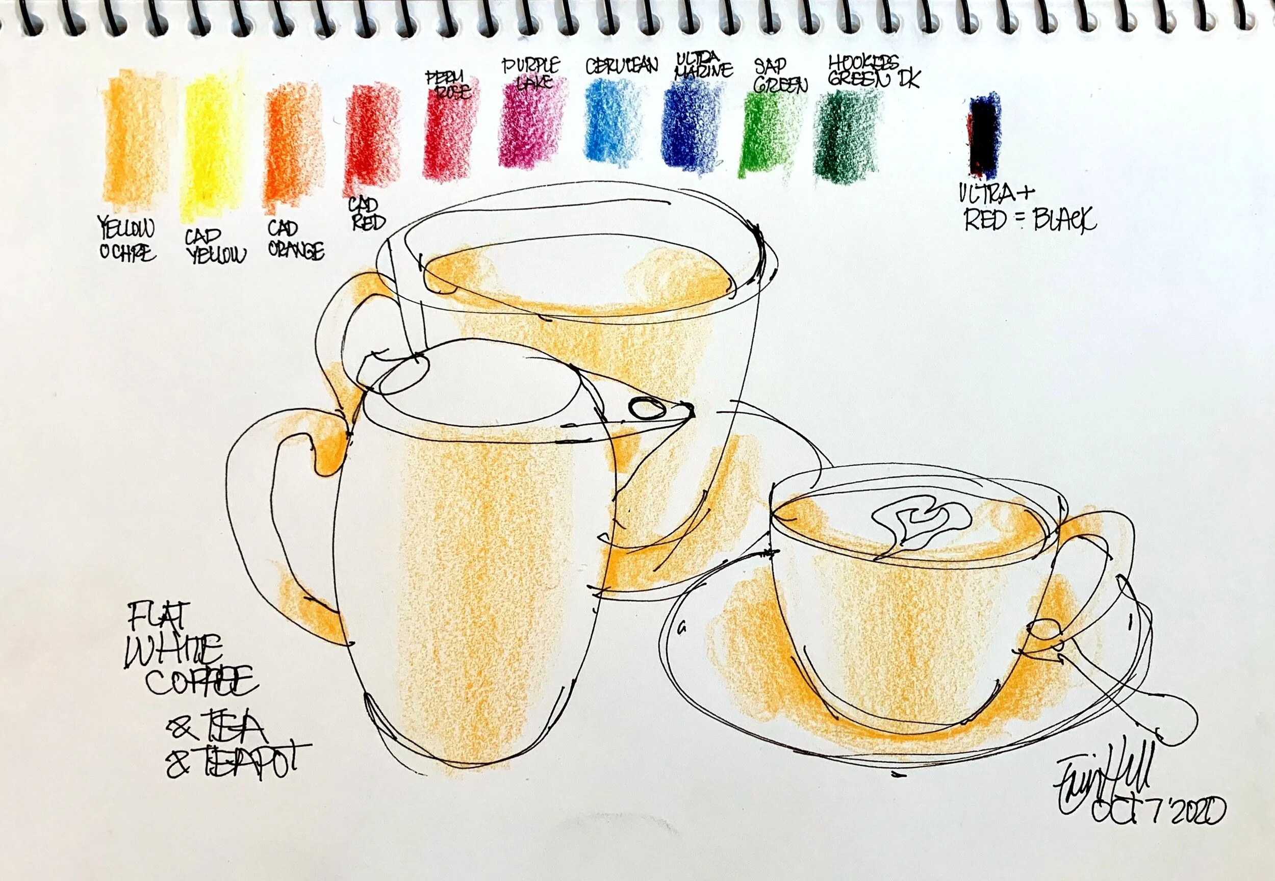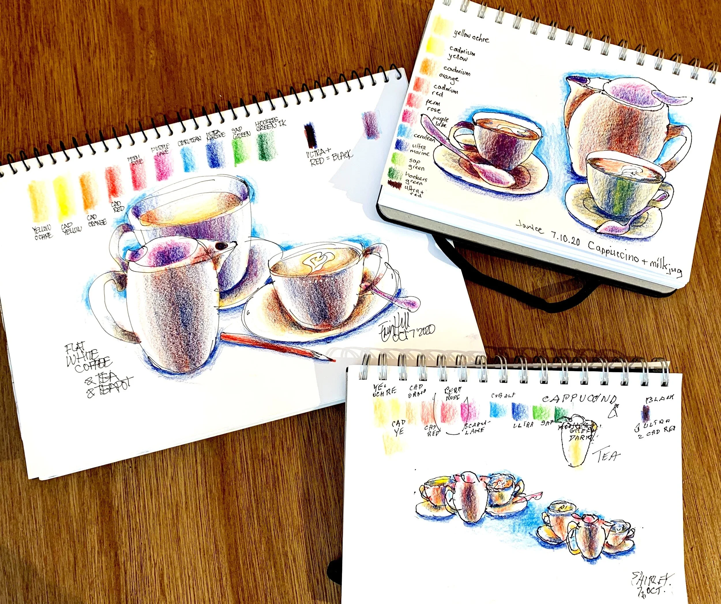 Loads of variety in our sketches here. We also have some beginners starting their sketching journey with flower and tea cup forms. We always have a fun time. We certainly don’t take ourselves too seriously!