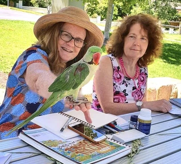 Everyone was settled and starting to sketch when a most glorious feathered creature decided to join the group. This was the Alexandrine Parakeet. A very friendly one at that. There she was, sitting on the sketching hand of our student! How can one possibly sketch with a rather large parrot sitting on your hand. Oh well. Connecting with nature is certainly fun.