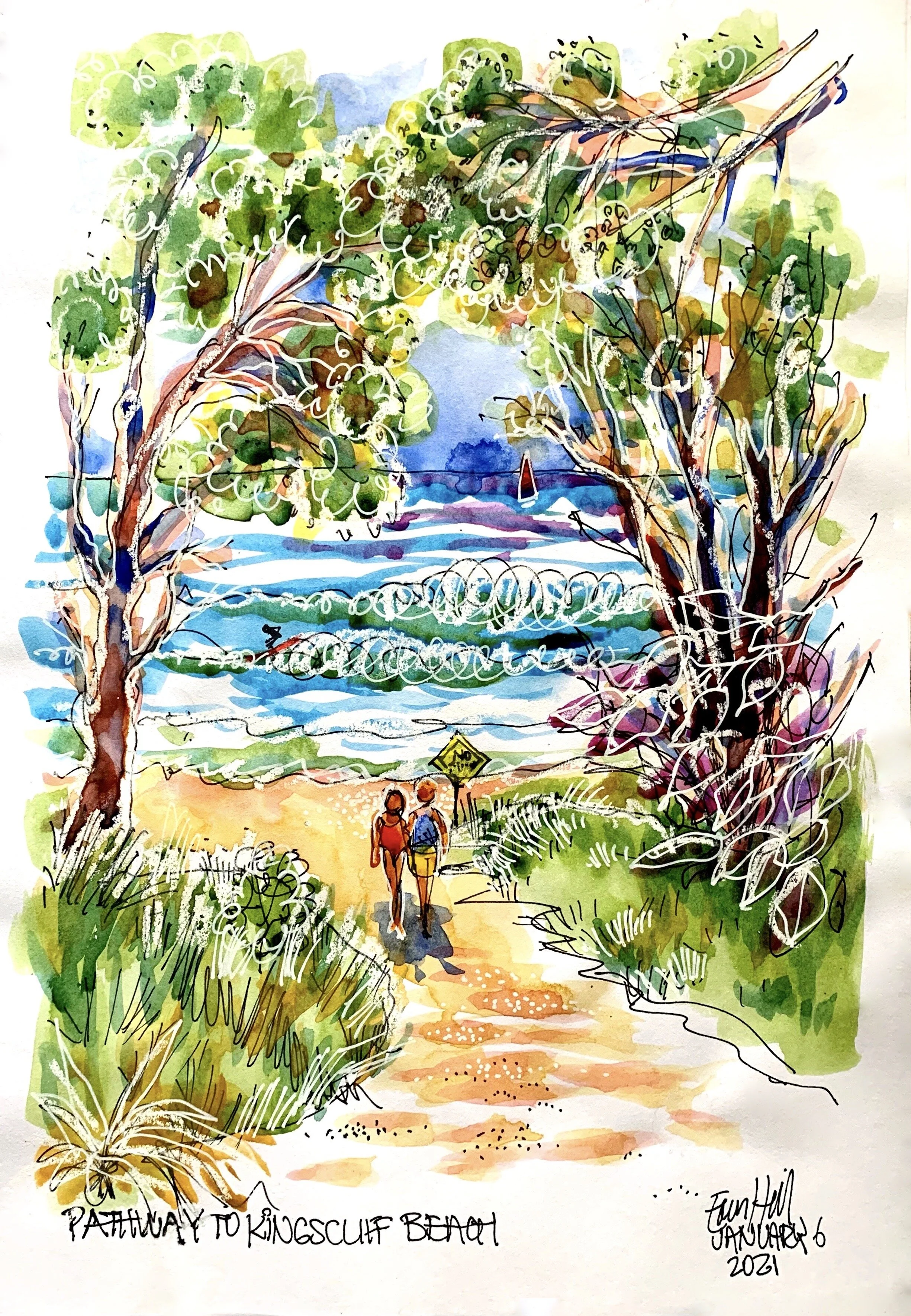 Our main sketch was to be a pathway to the beach. There are many of these along our beautiful coast and all sketchworthy. The sort of thing you could do do on your own, once you’d learned how to simplify what you’d see.