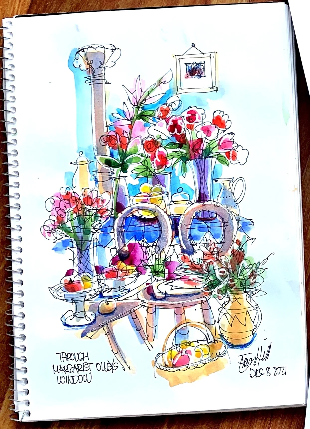 Margaret Olley was not a tidy housekeeper. Not her thing. The house is a moveable feast of collected bits and pieces stacked floor to ceiling in every room ready for her to paint at any moment. Fun to sketch. The messier the better. We really enjoyed the challenge.