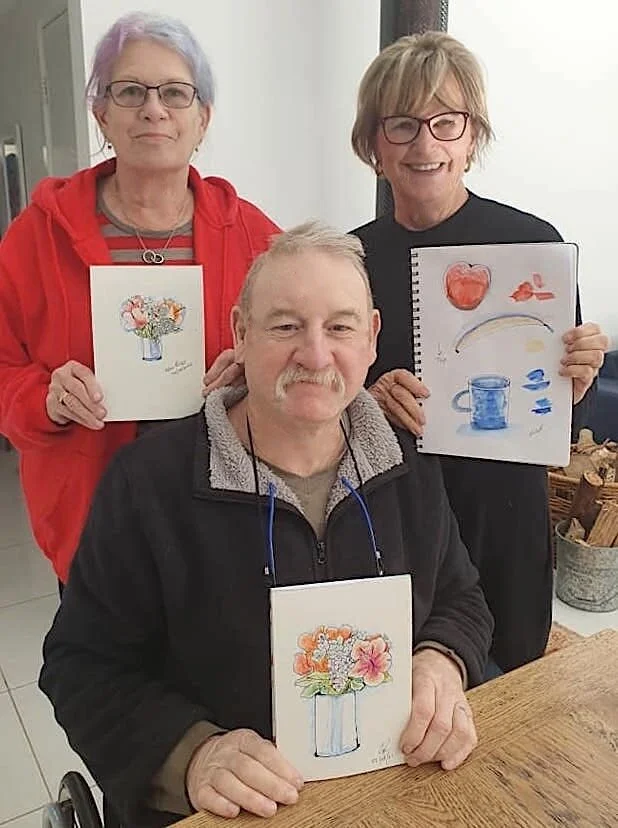 Wednesday was our Bangalow sketch day - at Kingscliff - doing direct watercolour sketching of petunias. That means no black line drawing to start. Instead just indicate your sketch in a wash of one colour. Now you can throw the paint on. Who knows what will happen! So much fun. We tossed a bit of purple and pink paint around - couldn’t stop!! They do look like petunias thank goodness.