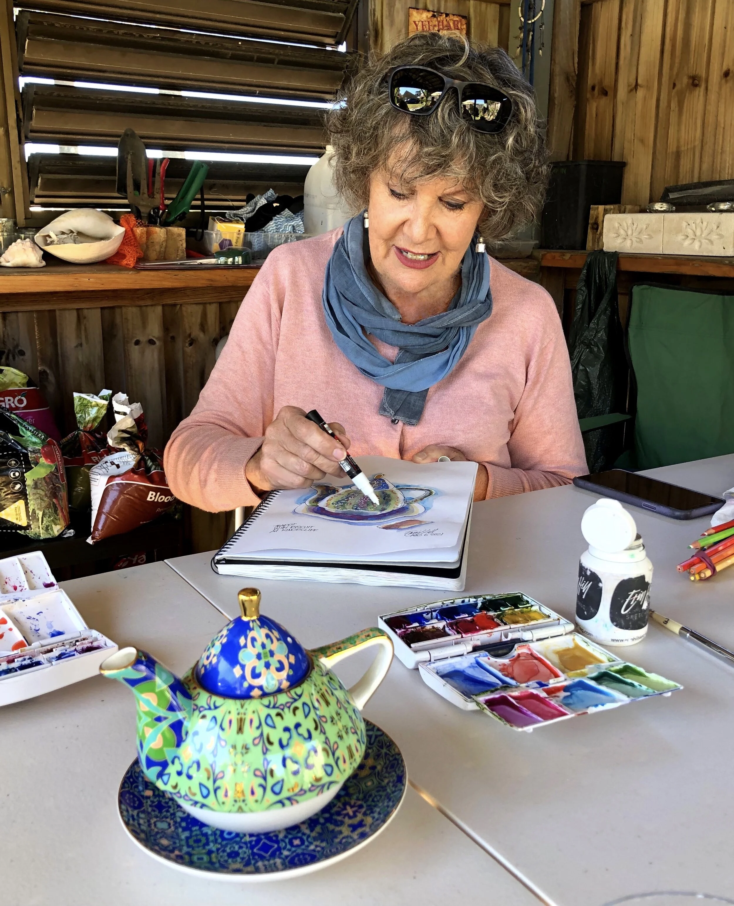 Friday was our Kingscliff sketch class - starting with coffee upstairs - then down to the Gazebo to complete our teapot sketches. Piece by piece we got all the shapes in then did the decorative patterns. finishing with Posca pen highlights. Happiness all round.