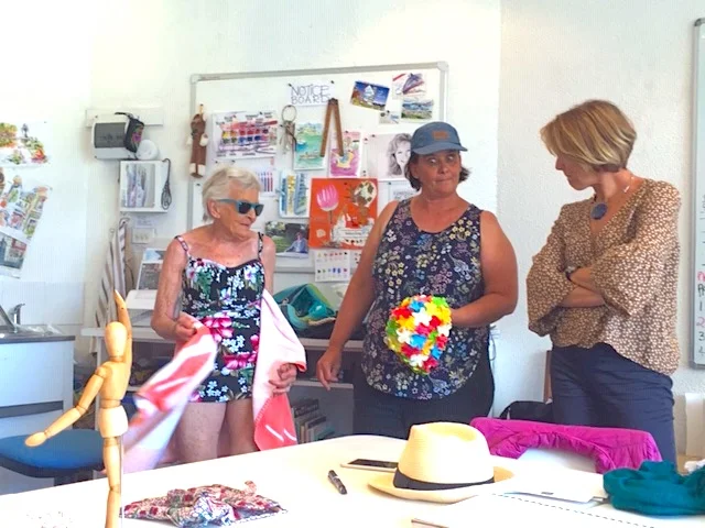 Mannequin sketching. Model extraordinaire Vera. She posed in swimsuit and flower cap and smart French striped top. Kirsten modelled as a groovy young thing.