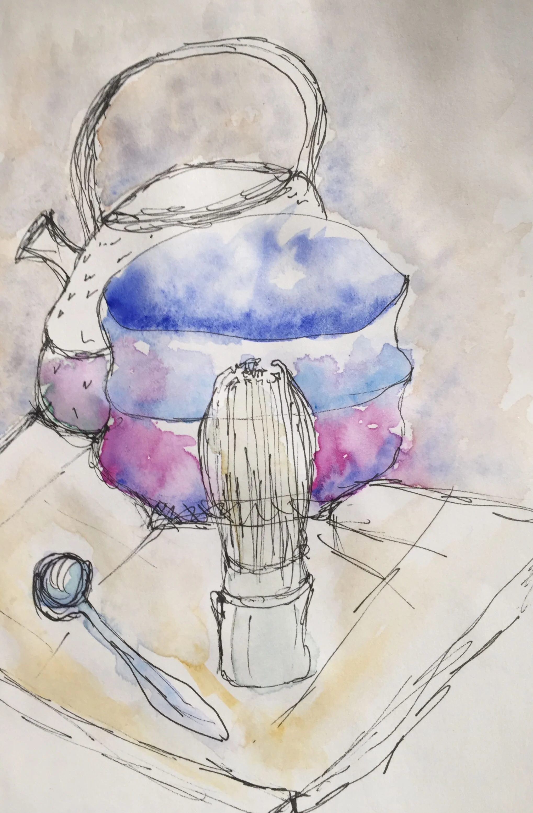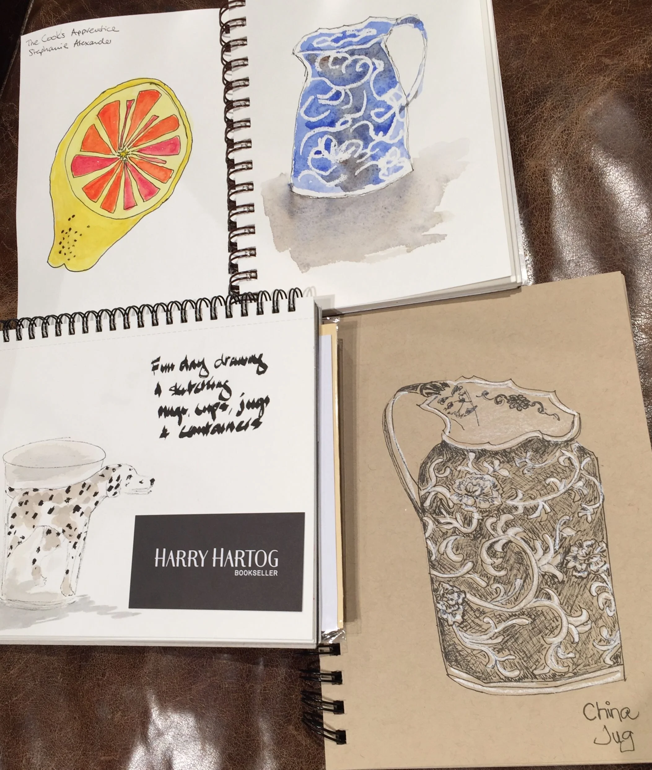 Our studio this week was at Harry Hartog’s Bookseller. A real favourite of our sketchers. We were studying design and colour, negative shape and pattern, inspired by teapots, jugs and cups and of course the marvellous decor and books all around.