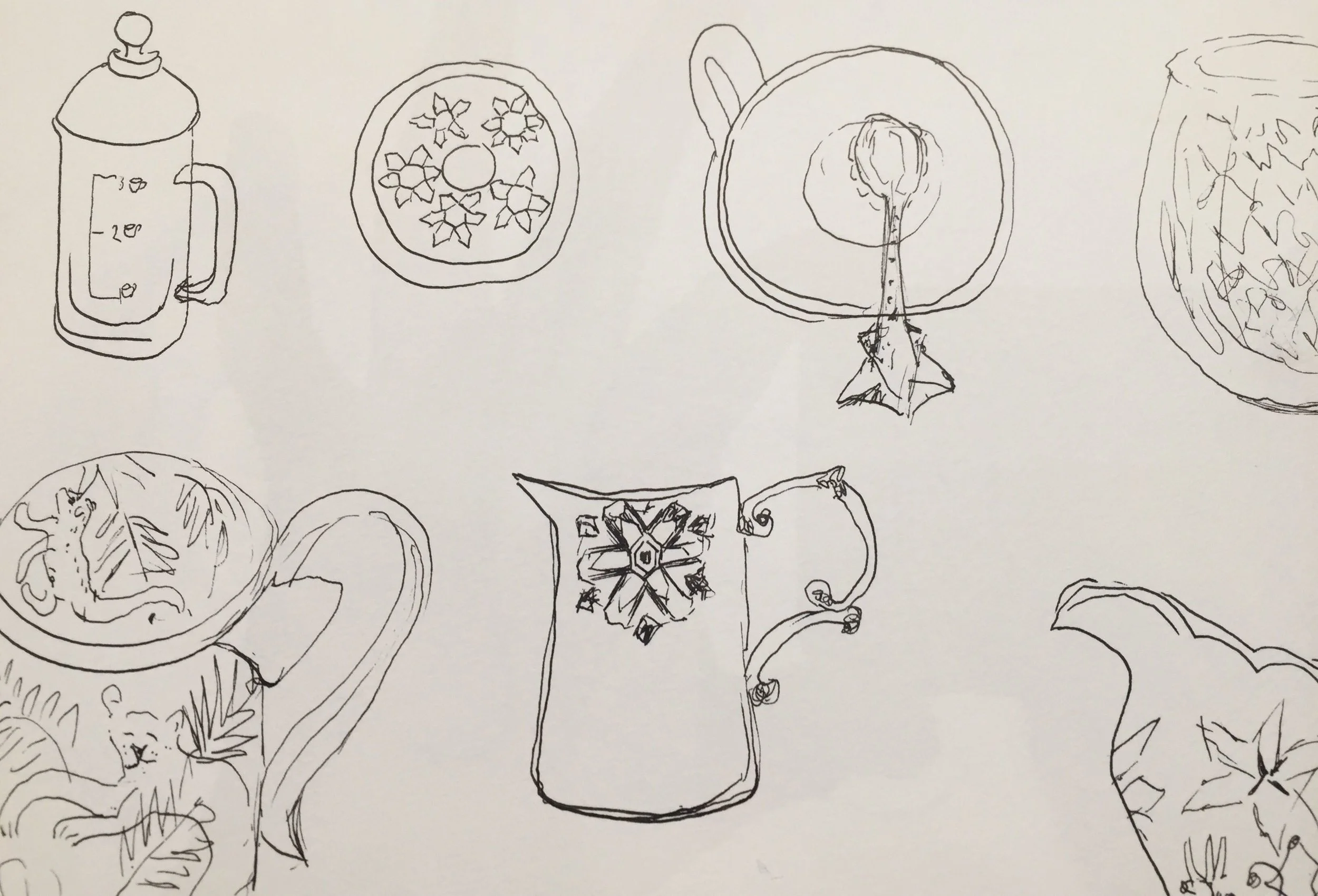 A little experimenting in our class this week. Our theme was tea cups, teapots and a variety of old jugs. In some sketches we took the positive design and put them into negative space, using the shape of the jug as the negative. We also took elements from the teapots and created pure design including tiles.