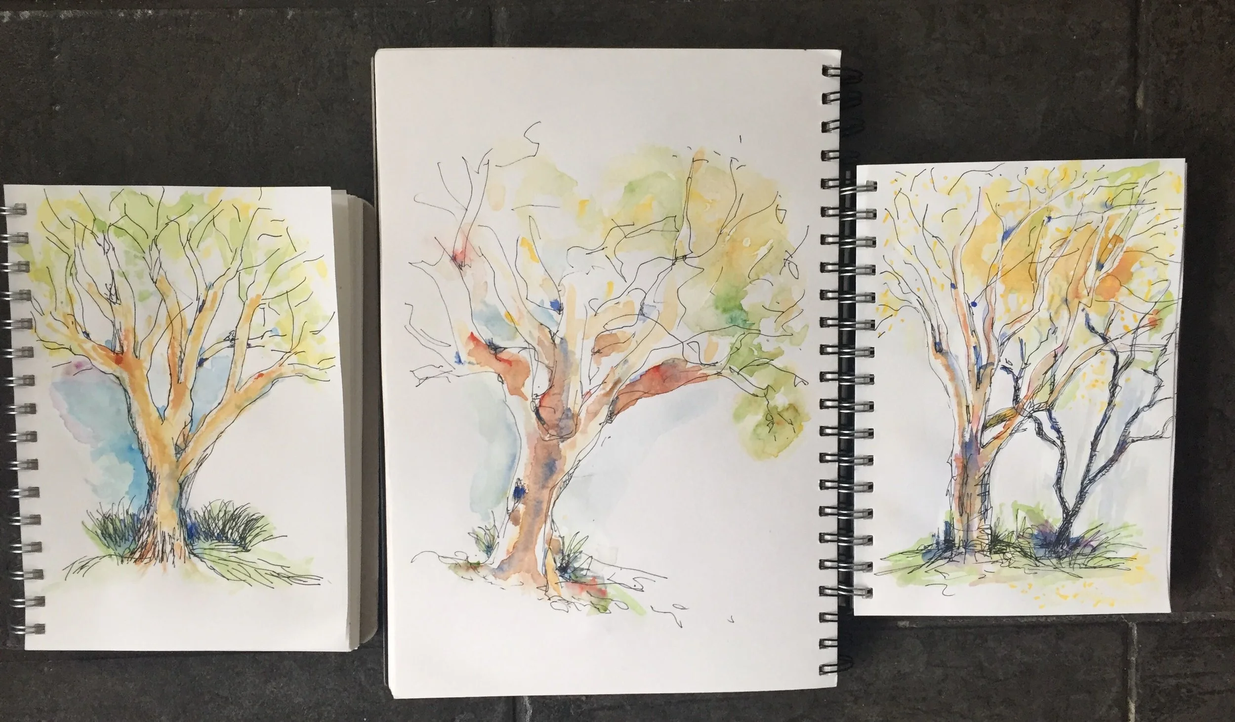 Down by the water, we planned the page and following my demo, everyone got stuck in and loosened up beautifully. Great sketches and very free and bright. Exactly what we want.