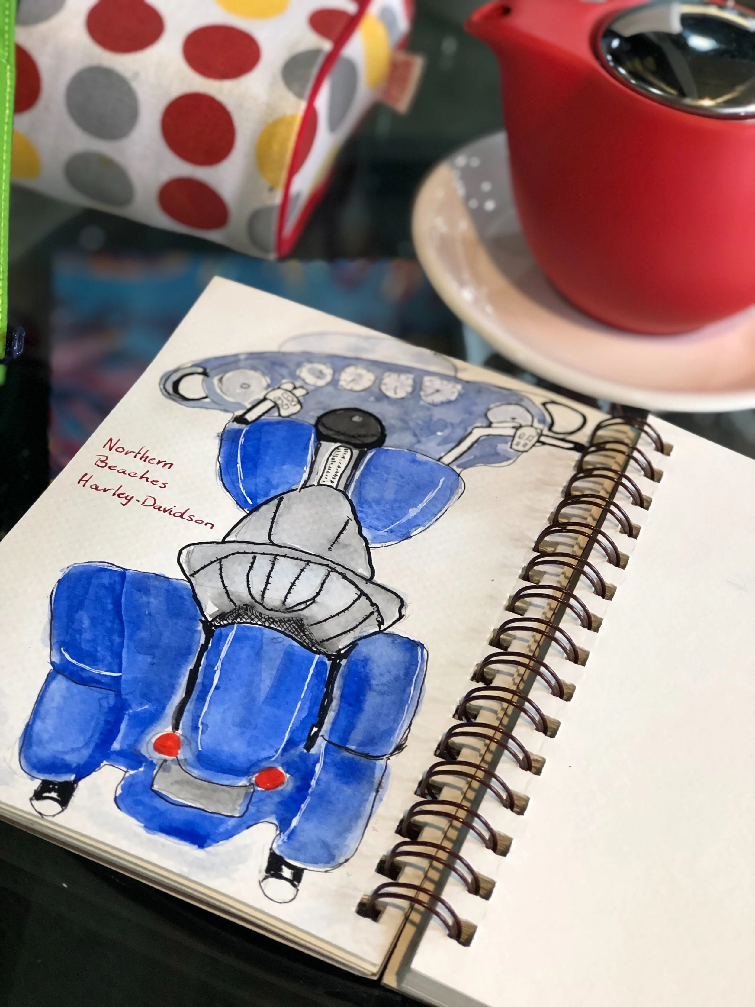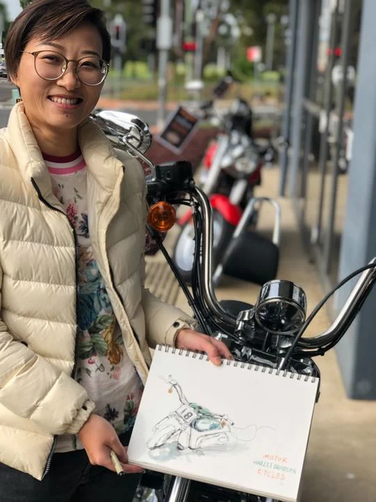 Great class at Harley Davidson. The shop floor was busy, the Green bike started as an interesting sketch, a sold sticker was added soon after, then it was gone! Ridden away by it’s new owner just as Jacqui finished. The cafe with yummy coffee was again very hospitable , as were all the Harley staff. Using water soluable markers ,minimal colour .