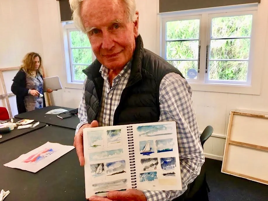 Location: South Curl Curl Beach coastal walkway. Cafe: Wildwater at Dee Why. Sketch view looking north using walkway and fence line to accentuate perspective. Discuss composition, foreground, middle ground and distance. Add Norfolk pines for scale and drama. Watersoluble pens as tonal warmup, then sketch with choice of pen & watercolour