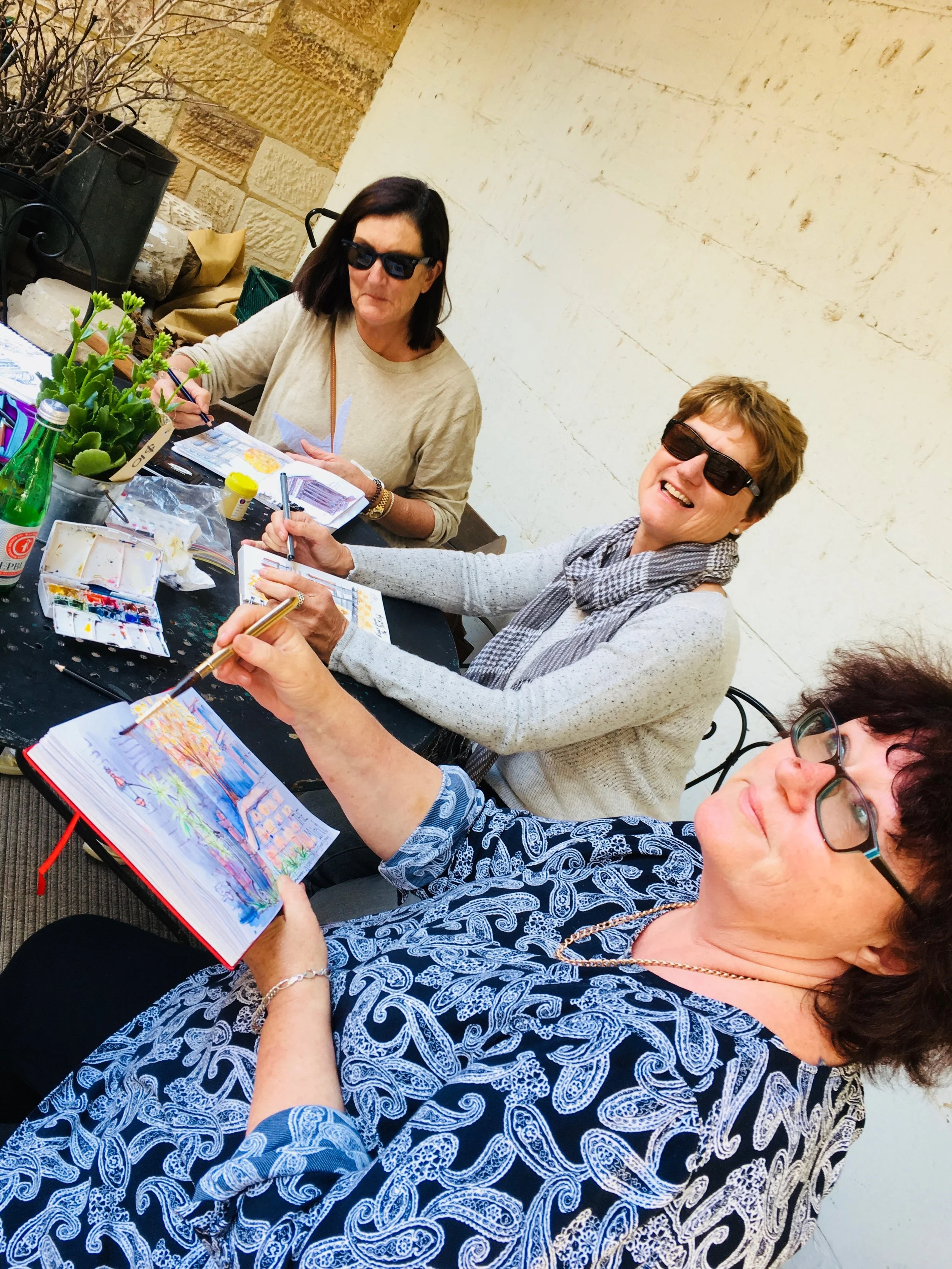 This is our 5th week for Travel Sketchers looking at the influence of well known international sketchers. We were looking Veronica Lawlor, a US based sketcher/illustrator/mixed media artist and her use of strong line, pattern and design. This is what our students were observing and trying out in their own work where it suited.