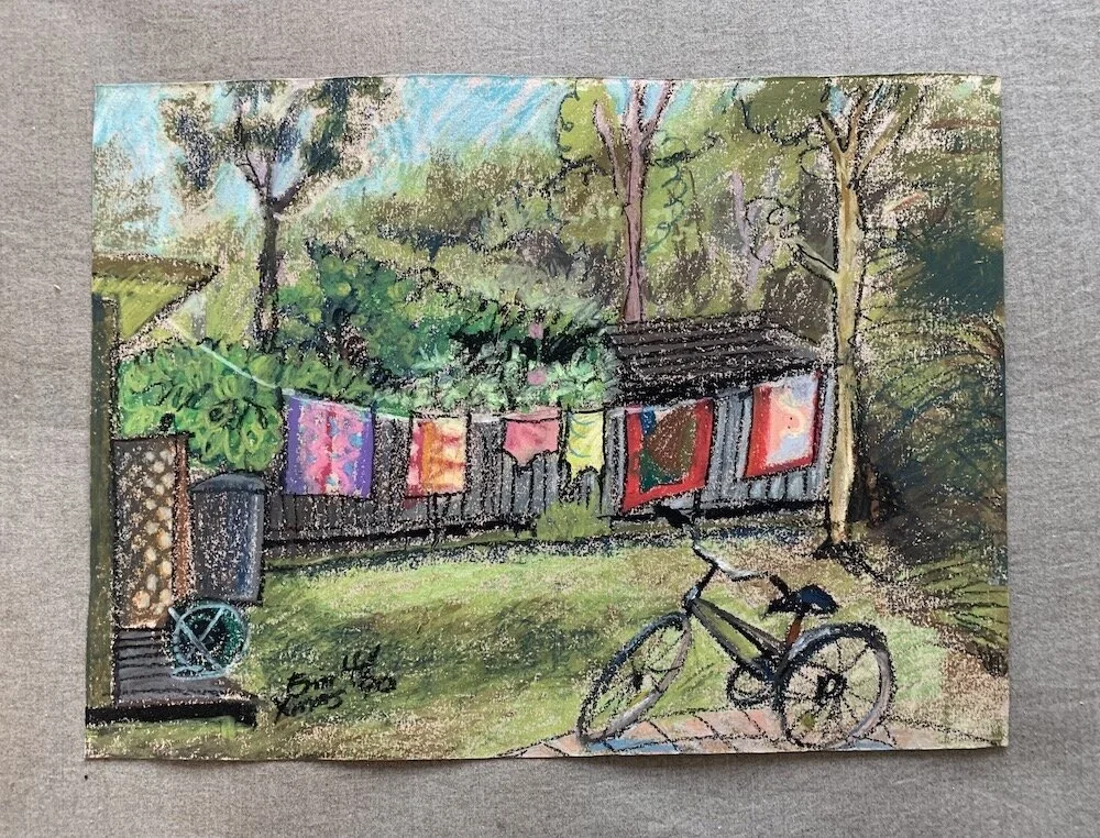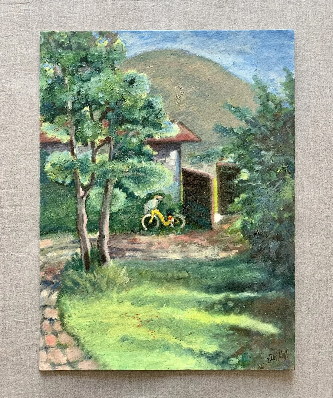 Original acrylic on board. ‘Yellow Bicycle Pearl Beach’ 1994. Size 30cm x 40cm. SOLD