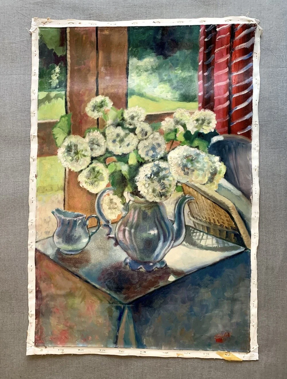 Original Oil on canvas. ‘Hydrangeas in Jug’ 1991. Size 50cm x 75cm. AU$350
