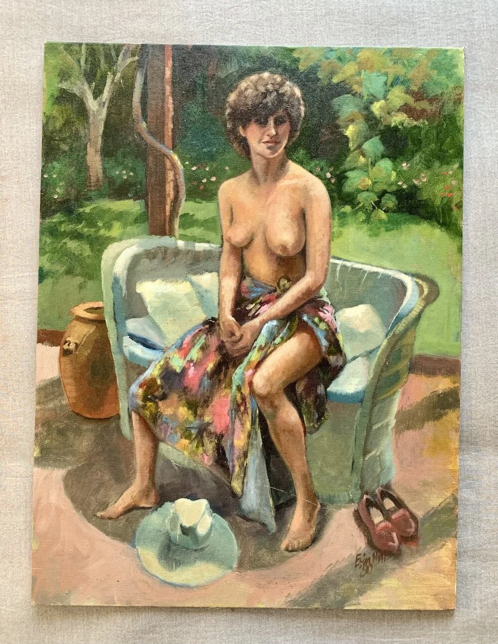 Original Oil on board. ‘Model in the garden. Mosman’ 1990. 45cm x 60cm. AU$250