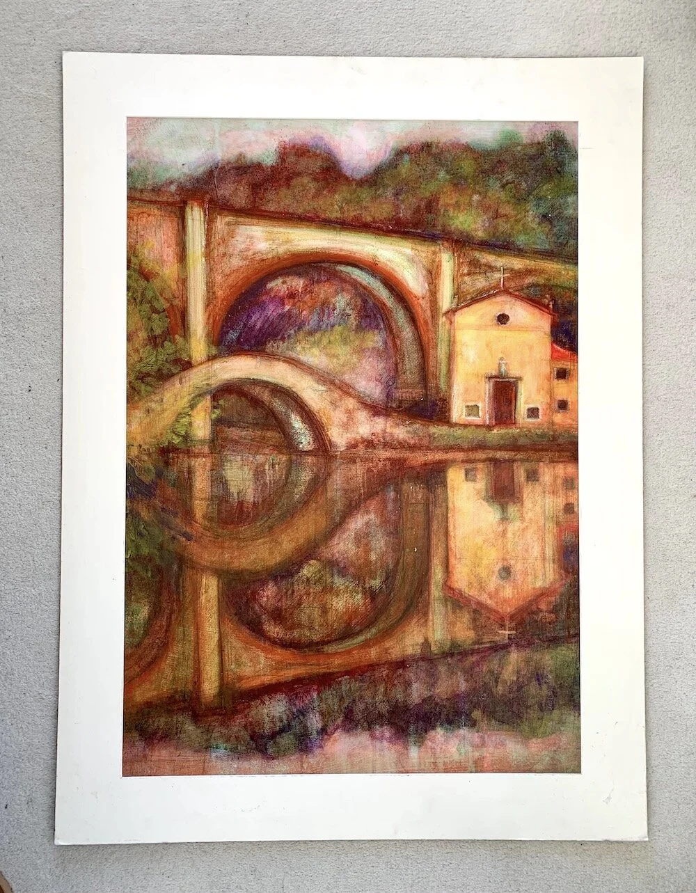Original Acrylic on board ‘Reflections. Twin Bridges & Chapel’. Painted on location Barga Tuscany Italy. 2014. Image size 60cm x85cm. AU$495